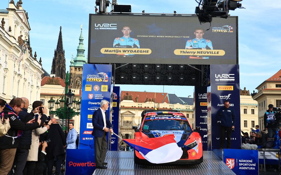 Viele Fans aus aller Welt strömten am Donnerstag zum Prager Präsidentenpalast, vor dem die Startrampe für den zwölften von 13 WRC-Läufen aufgebaut war. Sie erlebten einen stimmungsvollen Start, um den herum sich ein volles Programm mit Autogrammstunden und Interviewrunden spannte. Besonders euphorisch: Die Fans aus Belgien, denn bei der Central European Rally hat WRC-Tabellenführer Thierry Neuville (Hyundai, 207 Punkte) die Chance, den WM-Titel erstmals in das Land der Flamen und Walonen zu holen. Er führt im Kampf gegen seinen zweitplatzierten Teamkollegen Ott Tänak (EST, 178) und Toyota-Ass Sébastien Ogier (166) derzeit komfortabel. Die WM-Krone setzt sich der Belgier bei maximal 30 zu vergebenden Punkten am Wochenende auf, wenn er mindestens zwei Punkte mehr holt als Tänak und nicht mehr als zehn Punkte des Vorsprungs auf Ogier verlieren. „Unser Plan ist, die Rallye in einem guten Rhythmus zu absolvieren, unsere Linie zu finden und sie zu genießen“, gab sich Thierry Neuville am ersten Tag relaxt. „Wir hoffen alle, dass wir an diesem Wochenende den Titel holen können, aber wir müssen abwarten. Wenn wir uns wohl fühlen und alles gut läuft: warum nicht? Andererseits sind es noch zwei Monate bis Saisonende, und wir müssen weitermachen, in unserem Rhythmus und unserer Strategie.“